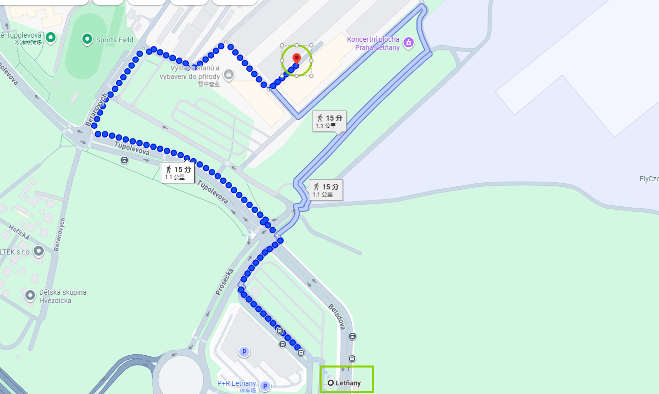 Letňany (مترو C) + تقریبا. 15 دقیقه پیاده روی